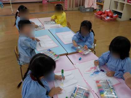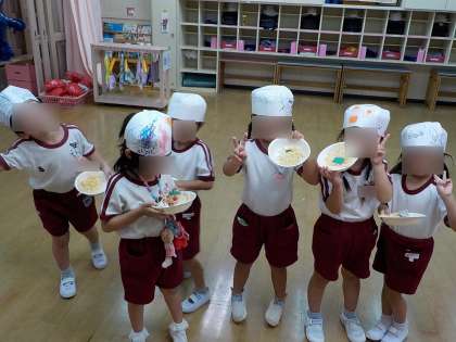 今日はみんなでラーメン屋さんごっこをして遊びました。「グルグルの模様だよ」「ラーメンかいた」とお絵かきをしたラーメン帽子をかぶって、ラーメン屋さんになりきって遊びました。みんなで毛糸や画用紙を、麺やトッピングに見立ててラーメンをつくりましたよ。