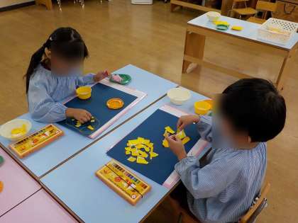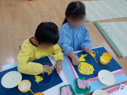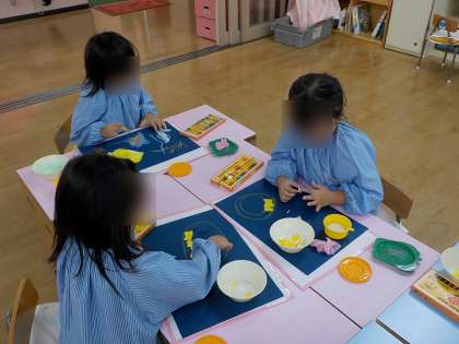 『おつきみうさぎ』の絵本を見て、お月見や月見団子、ススキなどに関心をもち、製作を行いました。画用紙に大きなお月様をかき、折り紙をちぎって貼っていくと、「だんだんお月様が出てきたよ」「今は半分のお月様で、もうすぐ丸いお月様に変身するねん」とお話しながらつくっていました。細かく折り紙をちぎって丁寧に貼る姿が見られました。周りに自分やお団子をかいて素敵なお月見の作品の完成です。