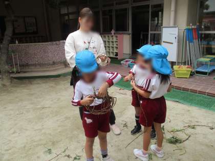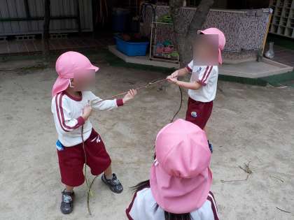 「引っ張っても全然切れへん」「めっちゃ丈夫やな」と芋のつるで綱引きや縄跳びを楽しんだり、つるを丸めて巻き込んでいきリースをつくったりしました。
