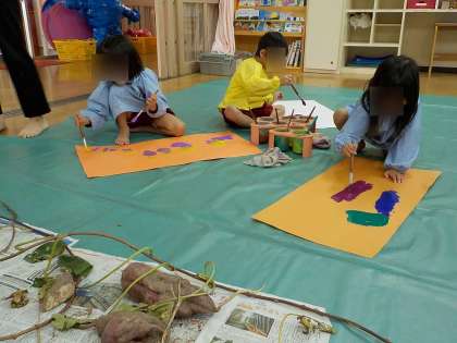 芋づるで遊んだ後は、楽しかったことを絵にかきました。「こんなに長いつるで、お芋がいっぱいあるねん」と経験したことを自分なりに表現していました。