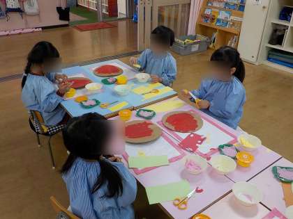 一学期からお店屋さんごっこを楽しんできたさくら組の子どもたち。今日はみんなでピザ屋さんごっこをして遊ぶことにしました。