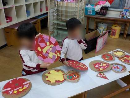丸い段ボールにトマトソース(赤色の絵の具)を塗り、画用紙を野菜に見立ててピザをつくりました。「ピーマンはいってる」「チーズたっぷりやねん」と、絵本で見たピザやお家で食べたことのあるピザを思い出しながらつくっていました。美味しいピザが出来上がると乾燥棚をオーブンに見立てて「早くピザ焼けるかな」と絵の具が乾くのを楽しみに待っていました。