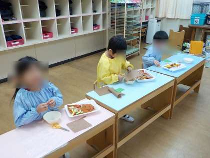 カレーライスの絵本を見た後に、「人参と玉ねぎが入ってる」「〇〇の家のカレーはチーズも入れるねん」と話し、製作を楽しみにする姿が見られました。画用紙だけでなく、フェルトや和紙、チューブなど様々な素材をに触れ、「これは人参」「チーズは細く切るねん」と素材を食べ物に見立てながら美味しいカレーライスをつくることができました。