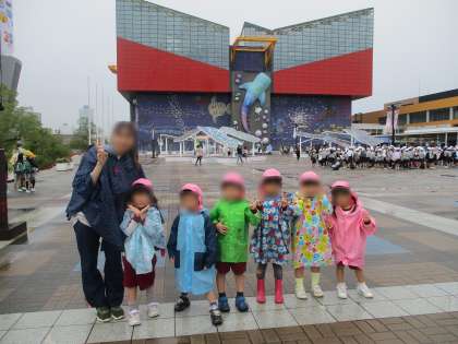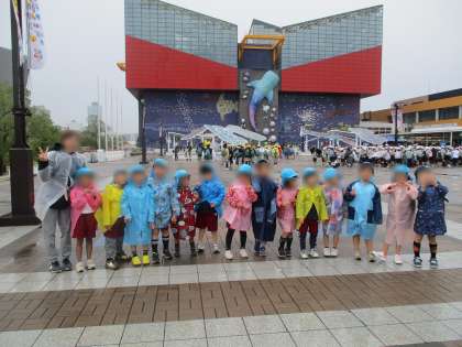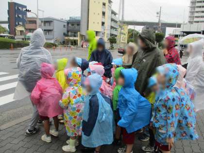 あいにくの雨でしたが、レインコートを着て、いつもとは違う雨の日の園外保育を楽しむことができました♪自分でレインコートを脱ぎ着する姿も見られました。