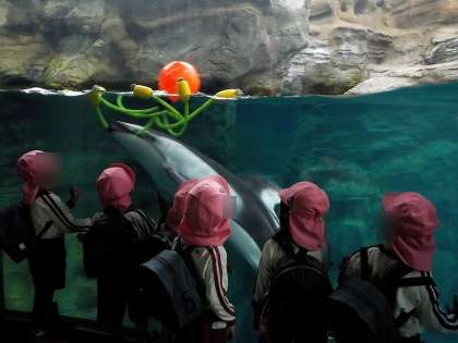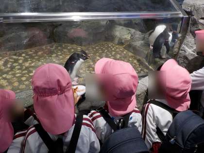 色々な種類のお魚に興味津々の子どもたち。「めっちゃ大きい魚いてる」「こっちはお腹がキラキラしてる」「ミャクミャクの色(赤と青)の魚見つけた」と発見したことを伝え合っていました。「イルカさん、こっちきて」と声をかけていると、イルカがさくら組の方によってきておもちゃで遊んでる様子を見せてくれました♪幼稚園に戻ってからも、みんなでペンギンさんになって遊んだり、ジンベイザメの大きな口を真似っこしたりする可愛らしい姿が見られました。