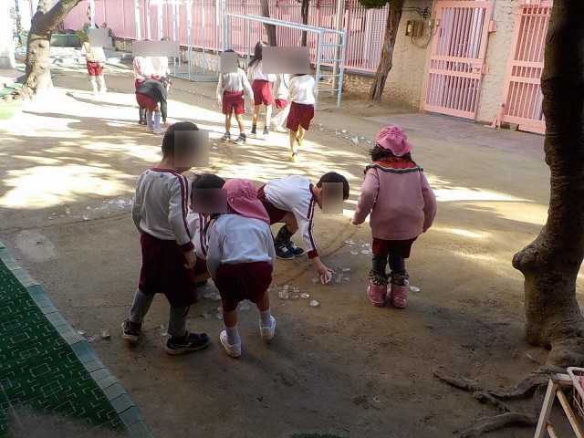 サンタさんが帰った後、外を見ると園庭にソリの跡と氷が!「サンタさんの国の氷がいっぱいだよ」「サンタさんがソリに乗ったときに落ちたのかな」とワクワクの子どもたちは、お空に向かって「サンタさんまた来てね」と声をかける姿が見られました。