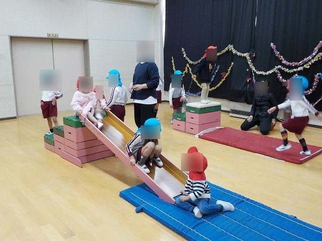 遊戯室で沢山遊んだ後は、在園児が歌を披露したり、一緒に『ちょっとだけ体操』を楽しんだりしました。