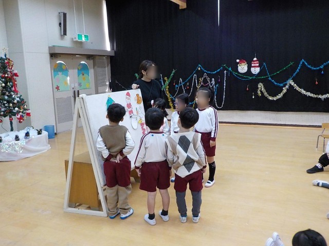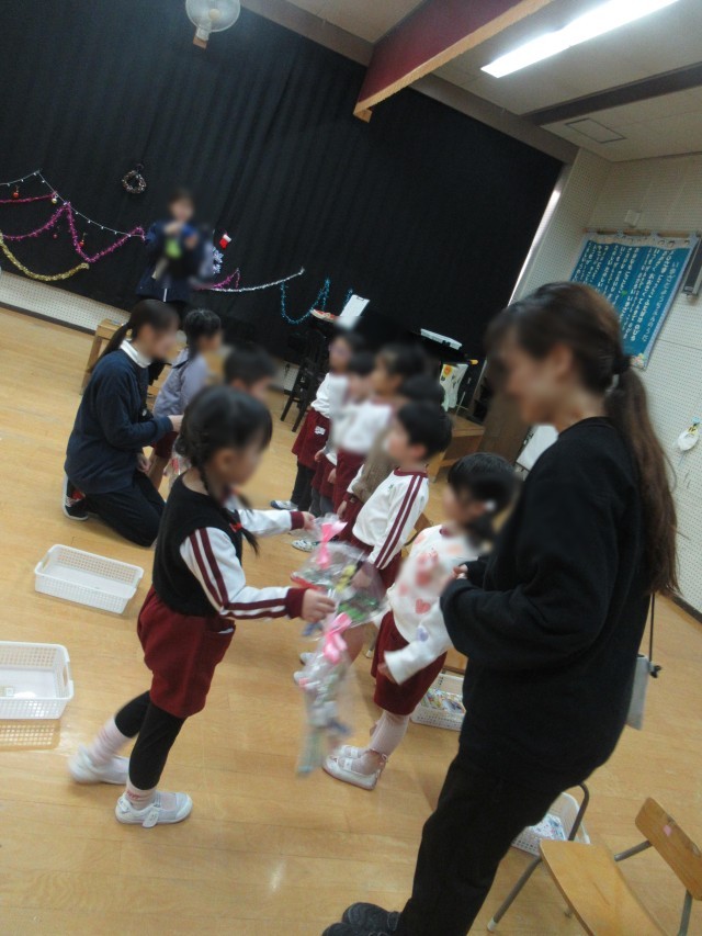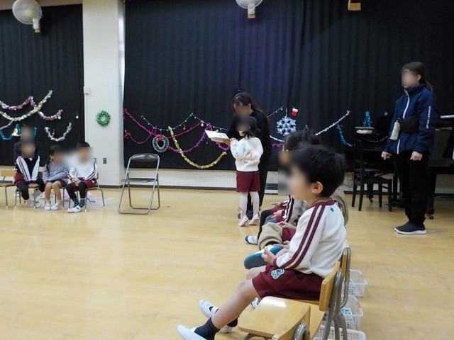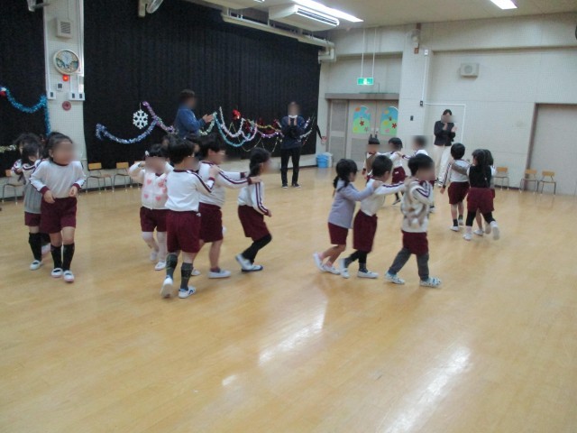 先日12月・1月生まれのお友達のお誕生日会が行われました。お誕生児はみんなに祝福されとても嬉しそうにしていました。園長先生からはお話のプレゼントをもらい誕生日ケーキのろうそくをみんなで消しました。さくら組さんからは素敵なキラキラこまをプレゼントにもらいました。家で遊ぶのが楽しみですね。みんなで最後に金のガチョーラというふれあい遊びをしました。先頭の友達の後ろに続いて離れないように進み、楽しかったですね。誕生児のお友達をみんなでお祝いできた日になりました。