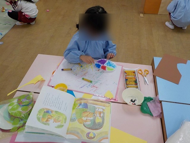 絵本に出てくるクーをよく見ながら顔をつくってメガネをかいたり、クーの家の絵を見て窓やドアノブ、家の飾りなどをつくったりする姿が見られました。「私は窓をつくるから、飾りのところやって」と友達と一緒に話し合って協力しながらつくっていました。