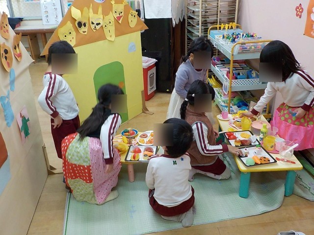 素敵なクーの家をつくった後は、昨日つくったクマのフーの家も一緒に使いながら、「みんなでお誕生パーティーをしよう」と楽しい遊びがはじまりました♪ご馳走をつくってみんなで「ハッピーバースデートゥーユー♪」とお誕生日会を楽しんでいました♪