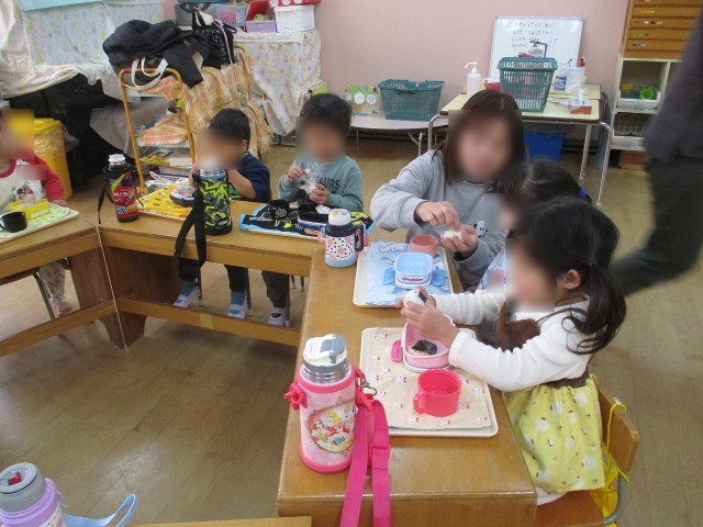 今日から、ふれあいサークルばらのお友達もお弁当を幼稚園で食べ始めました。