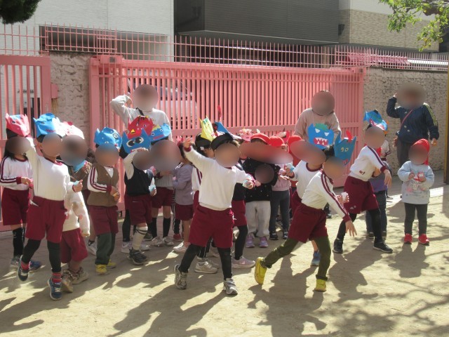 幼稚園では日本の伝統行事を大切に、子どもたちに伝えています。2月には節分があり、その意味を知らせクラスでお面づくりをしました。