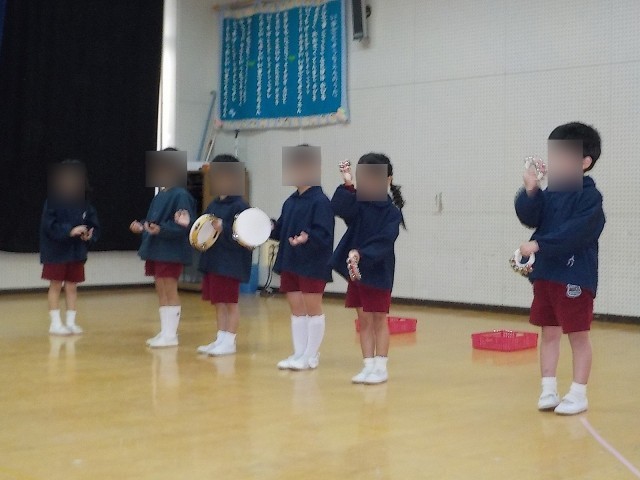 歌と楽器遊びでは、『おおさむこさむ』『わらいごえっていいな』を歌ったり、『白くまのジェンガ』に合わせて三つの楽器を鳴らしたりしました。オープ二ングで舞台に出て少し緊張が解けたさくら組の子どもたちは、元気いっぱい楽しんで歌ったり、リズムをそろえて楽器遊びをしたりしていました。みんなと声や音を合わせることができてとても嬉しそうにしており、次の劇遊びへの期待も高めていました。