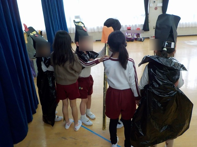 今日は、さくら組の『おともだちになってね』とあやめ組の『アラジン』の劇遊びをみんなで楽しむことにしました。自分たちのクラスの劇を教えてあげ、一緒に役になって表現することを楽しんでいました♪4歳児は5歳児の劇遊びを見せてもらったときから「あやめ組さんかっこいい、アラジンやってみたいな」と憧れの気持ちをもっていたので、お兄さんお姉さんに教えてもらうことができ、とても嬉しそうにしていました。5歳児は「次はこっちに行くよ」「こうするんだよ」と優しく年下の友達に教えてあげていました。