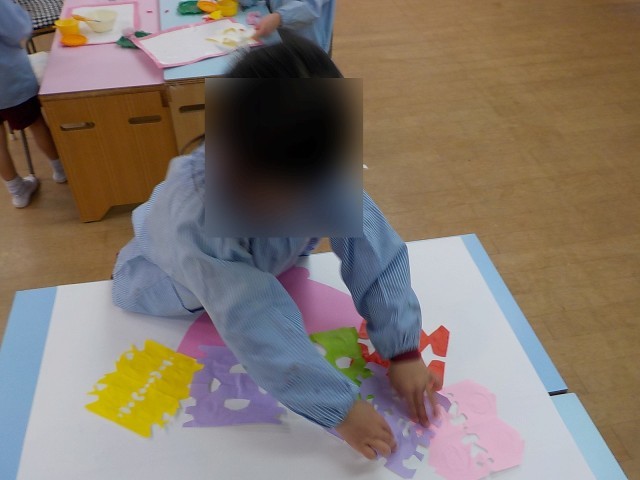偶然できた形に面白さを感じており、「見て見て、こんな形になったよ」と友達同士で見せ合う姿も見られました。素敵な模様になったみんなの折り紙を集めて素敵な花束をつくりましたよ♪