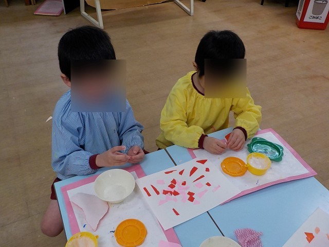 さくら組の子どもたちは、思わず体を揺らしてしまう姿も見られ、おはなしの世界を楽しんでいました。また、保育室に戻ると『いろがみ びりびり ぴったんこ』のおはなしに出てきた虹色電車やケーキをつくりたいと話し、みんなでちぎり絵を楽しみました♪