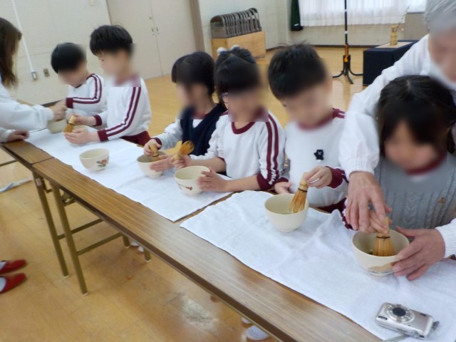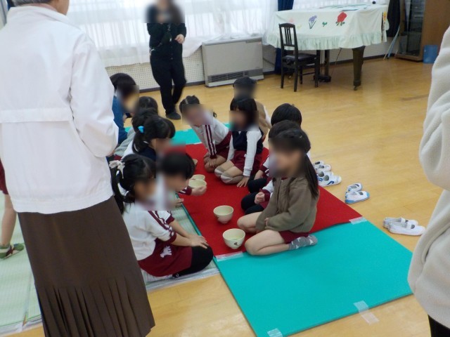 あやめ組の子どもたちはお茶席を体験しました。お茶の先生からお茶の点て方や作法を習いました。和菓子や、友達が点てたお茶をいただくことができ貴重な体験ができましたね。