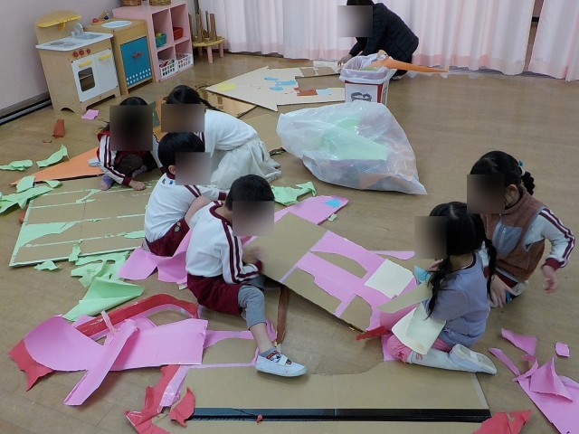 運動会のときにみんなでつくったミャクミャクや生活発表会で遊んだお家など、思い出たくさんの大きな作品とお別れしましたよ。