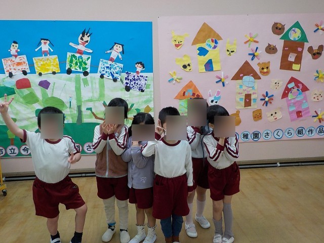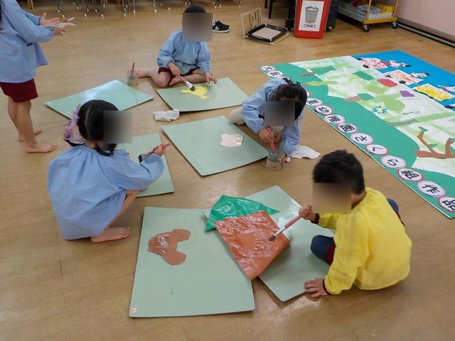 おはなし会で読んでもらったちぎり絵の虹色電車や、生活発表会でした『おともだちになってね』の動物たちを貼って思い出いっぱいの吊り看板をつくりました。「見て、みんなでつくったの」と嬉しそうに他の先生方にも吊り看板を見せる姿が見られました。