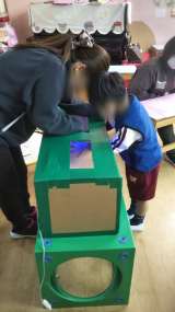 主事さんお手製の「手洗いチェッカー」に手を入れると、洗い残しがはっきりとみえます...