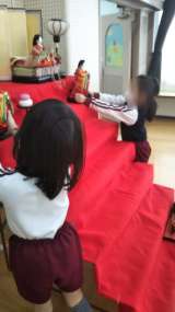 あやめ組が飾ったおひなさまをさくら組が見に来ました。遊戯室に入ったとたん「わあー...