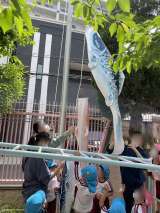 みんなでこいのぼりをあげました。だんだん上に行くこいのぼりを見て「ばいばーい!」...