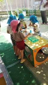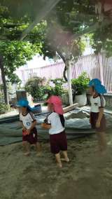 今日は3人だけの預かり保育。涼しい午前中に日陰のある砂場で遊んでいます。 セミが...