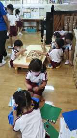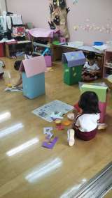 さくら組が可愛いお家を作っています。どうやらオオカミさんから隠れるためのお家のよ...