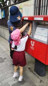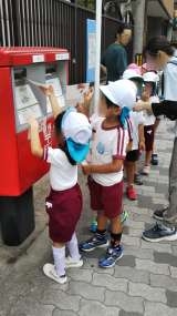 敬老の日に向けて、子どもたちがおじいちゃんおばあちゃんに宛ててかいたハガキを投函...