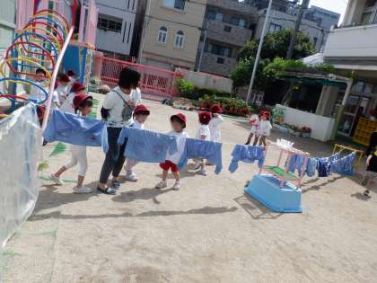 ぬたくりで遊んだ後は、汚れたアトリエ着をみんなでお洗濯♪
