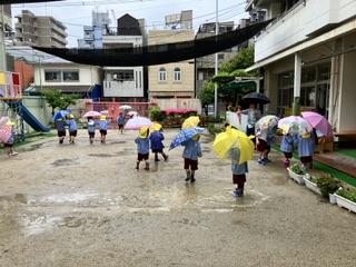 遊びながら先生が傘の差し方やたたみ方を教えてくれました。