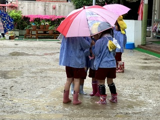 お友達と一つの傘に入ると違う世界みたいだね。水たまりも長靴ならへっちゃらだよー!