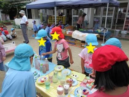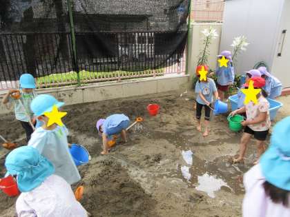 今日は保幼こ小連携で水遊び交流会をしました。水遊び、泥遊び、色水遊び、泡遊び、かいたりつくったりした物を水に浮かべたりして遊びました。最初は緊張していた子どもたちも 遊び終わった後は「〇〇つくって楽しかった」と振り返りの話し合いで色々話をしてくれました。「また、一緒に遊ぼうね」と約束して、次のプール遊びを楽しみにしています。