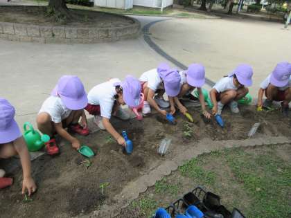 園で種から育てたひまわりの苗を地域の公園に植えに行きました。これから水やりをしながらひまわりの生長を楽しみたいです。