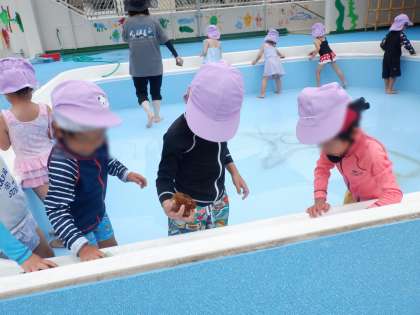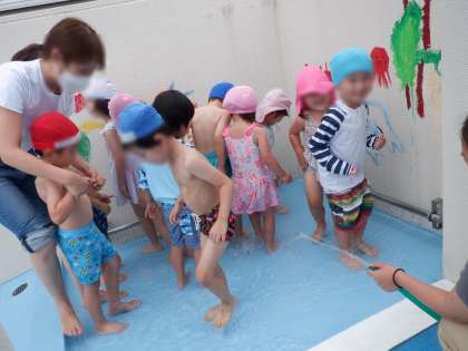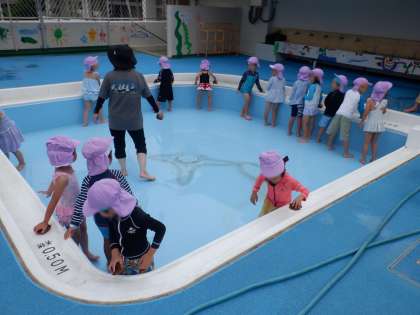 きく組・もも組のお友達も水着に着替える練習をして、プールにやってきました。