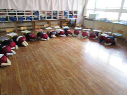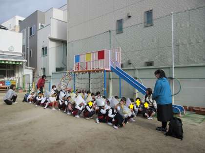 今日は地震とその後火災を想定して、避難訓練を行いました。子どもたちには、時間を知らせず避難の放送を聞いて、先生の所に集まりました。揺れがおさまるまでダンゴムシのポーズをとって自分の身を守っています。その後、先生の指示を聞いて園庭に避難しました。