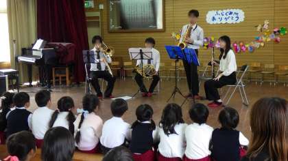 まずは、大阪音楽大学の学生さんたちの演奏。トロンボーン ホルン テナーサックス オーボエのきれいな音色で、みんなが大好きな♪さんぽ や♪せかいじゅうのこどもたちが などを演奏してくださいました。一緒に歌ったり、リズムに合わせて体を揺らしたりして楽しみました。