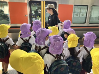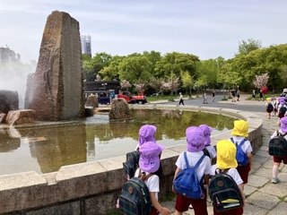 ふじ組、きく組は大阪城に遠足です。電車に乗って、公園の中を天守閣に向かって歩いています。