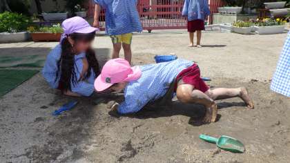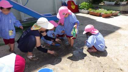 砂場での泥遊びと違い、掘ると粘土質の土が出てきて、砂場とは違った感触の泥ができました。