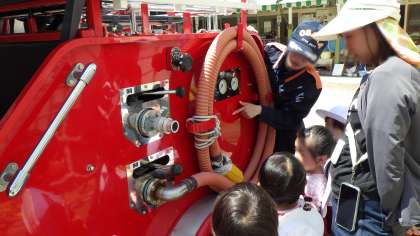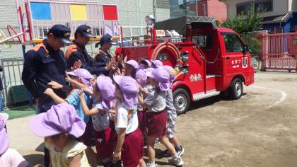 消防車が幼稚園にやってきて、近くで見たりさわったり、乗せてもらったりしました。