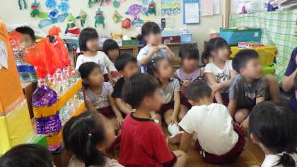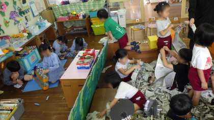 あすはPTA主催の夏祭りです。いろいろな楽しいコーナーを準備してくださる中で、ふじ組も、もも組さんやきく組さんを楽しませてあげる遊びを何か企画しよう!とみんなで考えました。