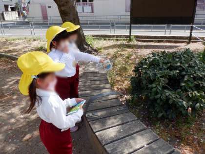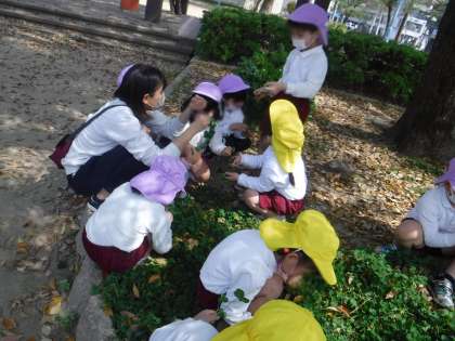 お天気が良かったので、ふじ組さんときく組さんで東小橋公園に行きました。新しいふじ色と黄色のカラー帽子がとても似合っています。