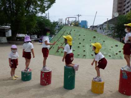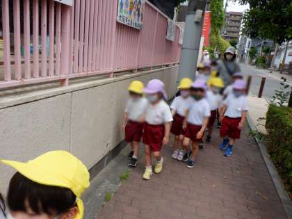 来週の園外保育に向けて、一緒に手をつないで歩いてみました。「気を付けてね」「危ないからこっちを歩くよ」と、ふじ組さんがしっかりリードをして歩いてくれましたよ。信号の渡り方、電車の乗り方など一つ一つ先生が知らせ、子どもたちと確認しながら歩きました。