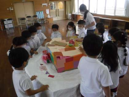 もも組は手形でチョウチョウを、きく組は色とりどりのお花を、ふじ組はみんなの顔と文字をかきました。