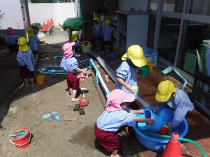 近くで様子を見ているもも組に「こうやってやるんだよ」「この泥気持ち良いよ!」と、きく組が優しく声をかけてあげていました。もも組は嬉しそうにきく組の真似をしてバケツで水を運んだり、泥を触ってみたりしていましたよ。同じ場で遊んでいるだけで、自然と関りや遊びや広がっていきます^^