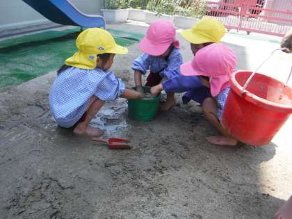 今日も天気が良く、きく組が砂場遊びや泥遊びを楽しんでいるともも組が集まってきました。