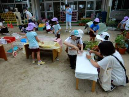 今日も、小さなかわいいお友達が遊びに来てくれました。スーパーボールすくいや色水遊び、砂場でも遊びました。タイヤをコロコロ転がしている力持ちさんもいましたよ。
