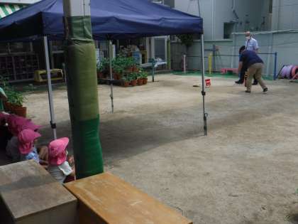 避難訓練後、きく組・ふじ組は園内の消火器探検をしました。