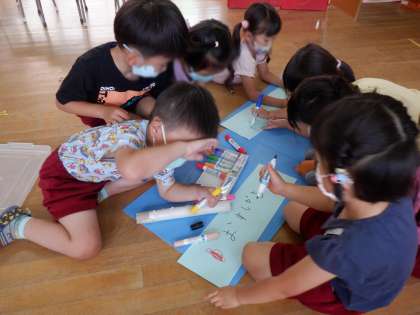 お店屋さんとお客さんのやり取りを楽しんでほしいと思い、お店を準備すると「看板がないとお客さんがわからない」と、みんなで看板もつくっていましたよ。いつか、もも組さんふじ組さんにも来てもらいたいですね。