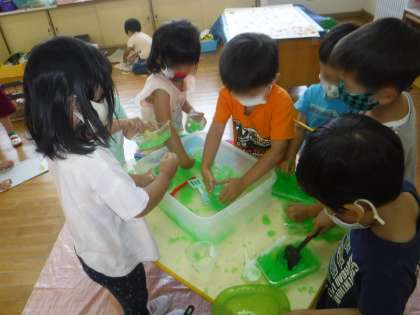 もも組のお友達が、寒天の感触や色の美しさを存分に味わって遊びました。